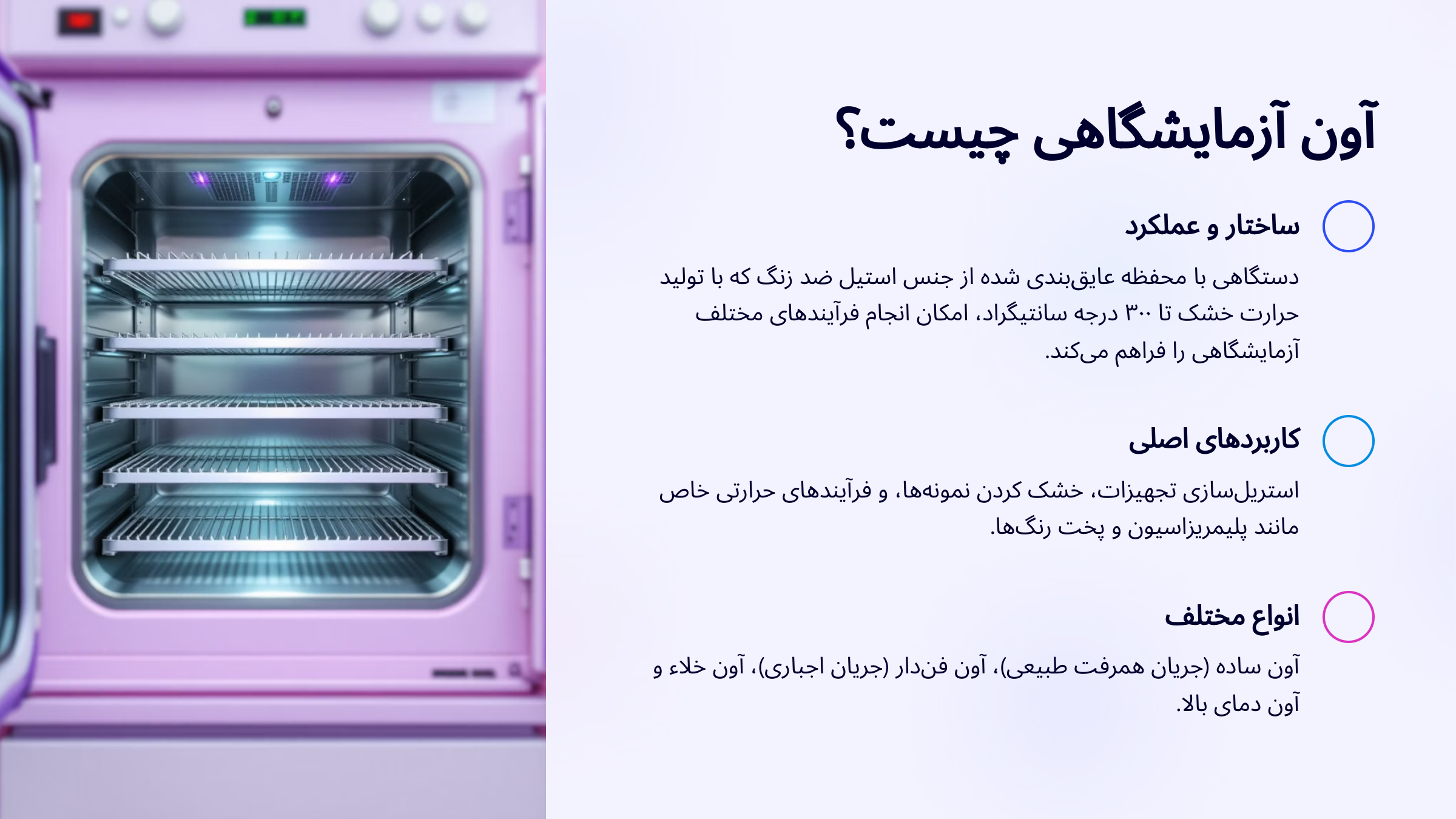 آون آزمایشگاهی برای رطوبت زدایی از انواع نمونه ها، مواد شیمیایی و معرف ها استفاده می شود. این فرآیند در تجزیه و تحلیل های دقیق بسیار مهم است.