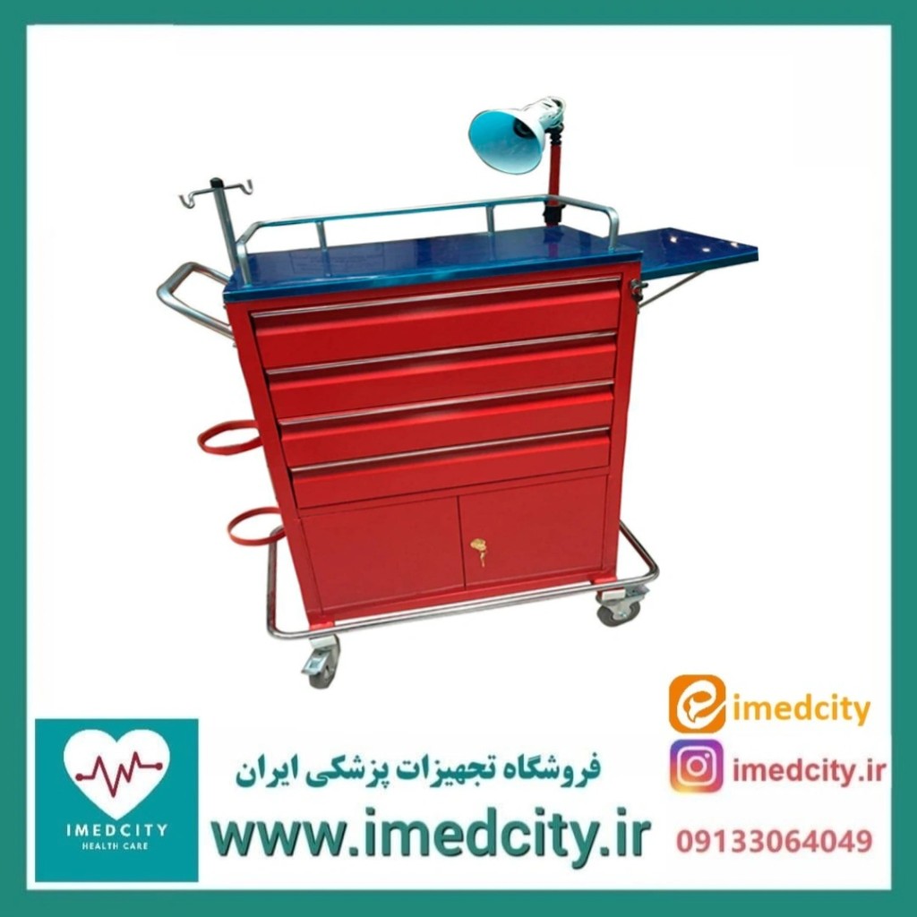 ترالی اورژانس فلزی چهار کشو کمددار رویه استیل سبک پزشک آرا