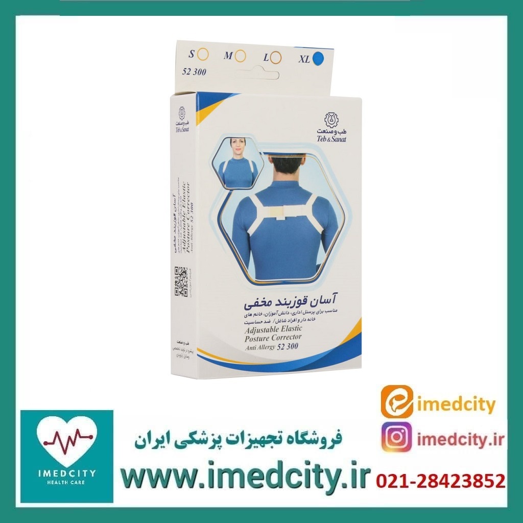 آسان قوزبند مخفی طب و صنعت علاوه بر اینکه از خمیدگی پشت و افتادگی شانهها جلوگیری میکند، موجب افزایش حجم تنفس و نگهداری تنه در وضعیت صحیح و حالت مناسب بدون ایجاد محدودیت حرکتی میشود. این وسیله موجب افزایش حجم تنفس و نگهداری تنه در وضعیت صحیح و حالت مناسب نیز میشود.از ویژگیهای خاص این محصول میتوان به قابلیت تنظیم آن جهت اعمال نیروی مطلوب برای کاربردهای مورد نظر بدون ایجاد محدودیت حرکتی اشاره کرد. تمامی خمیدگیهای پشت با این وسیله قابل پیشگیری و درمان نمیباشد، توصیه میگردد قبل از استفاده از هر نوع قوزبند، بیمار توسط پزشک متخصص ستون فقرات معاینه شود.