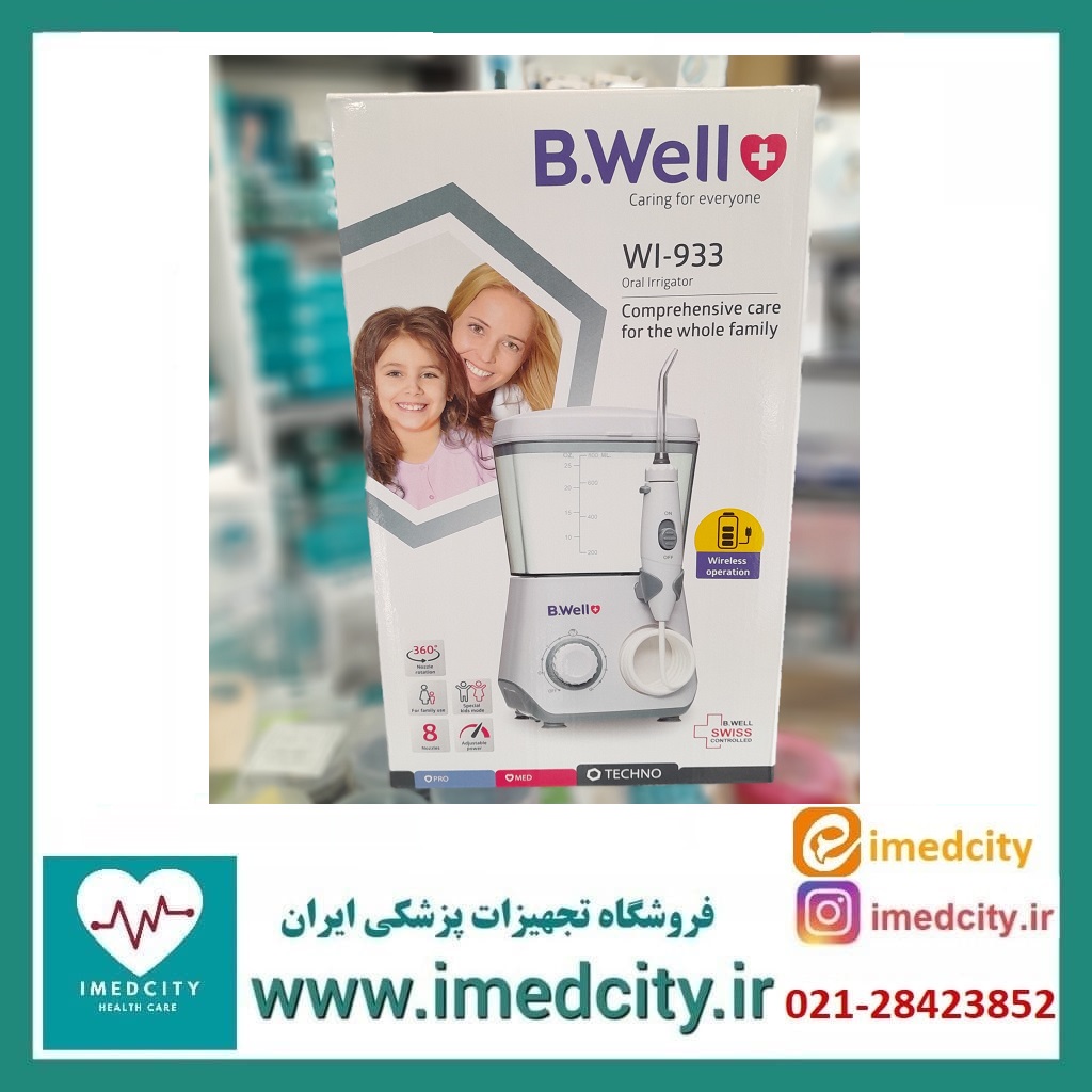تمیز کننده پیشرفته دهان و دندان بی ول مدل WI-933 که به آن نخ دندان آبی نیز گفته میشود، امکان تنظیم فشار آب در 10 درجه متفاوت از 30-125 PSI را به شما میدهد. میزان پاشش آب این محصول 1700 پالس در دقیقه میباشد. این محصول دارای 8 سری شامل، 3 سری استاندارد (برای استفاده عمومی)، 1 سری ایمپلنت، 1 سری ارتودنسی، 1 سری پریودنتال (برای جرمگیری)، 1 سری زبانشور و یک سری مسواک میباشد؛ که با قابلیت چرخش 360 درجه سریها، برای افرادی که دارای اورتودنسی، روکش، ايمپلنت و دندان مصنوعی می باشند و یا میخواهند لثه های خود را تقویت کرده و بوی بد دهان خود را که به واسطه ماندن ذرات ریز غذا در زیر لثه ها است از بین ببرند، بسيار ایده آل است. این دستگاه دارای مد نرم برای استفاده راحت تر کودکان نیز میباشد.