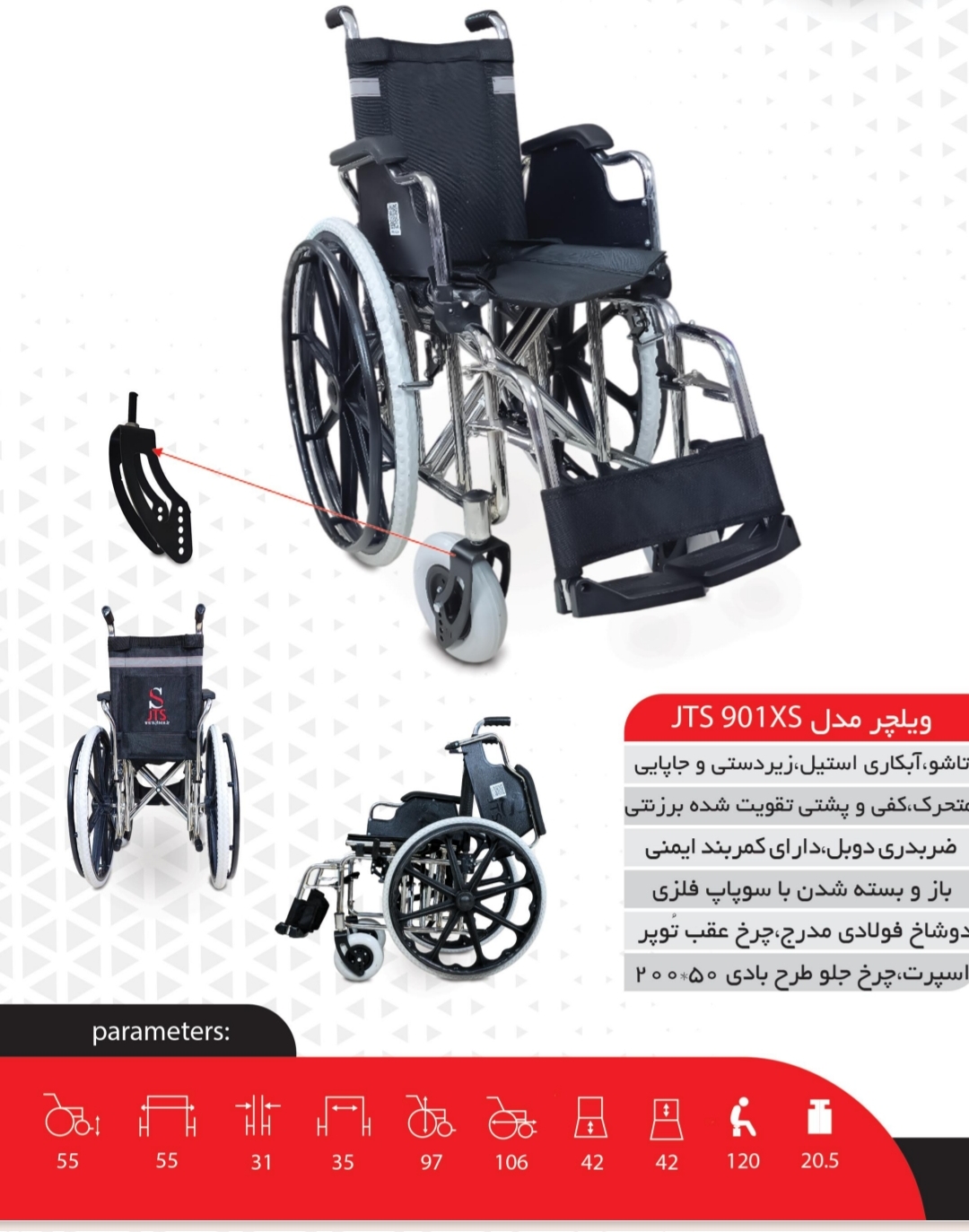یک ویلچر تاشوی مستحکم و کاربردی است که برای استفاده روزمره طراحی شده است. فریم این ویلچر از استیل آبکاریشده ساخته شده که علاوه بر مقاومت بالا، در برابر زنگزدگی نیز عملکرد قابل قبولی دارد.