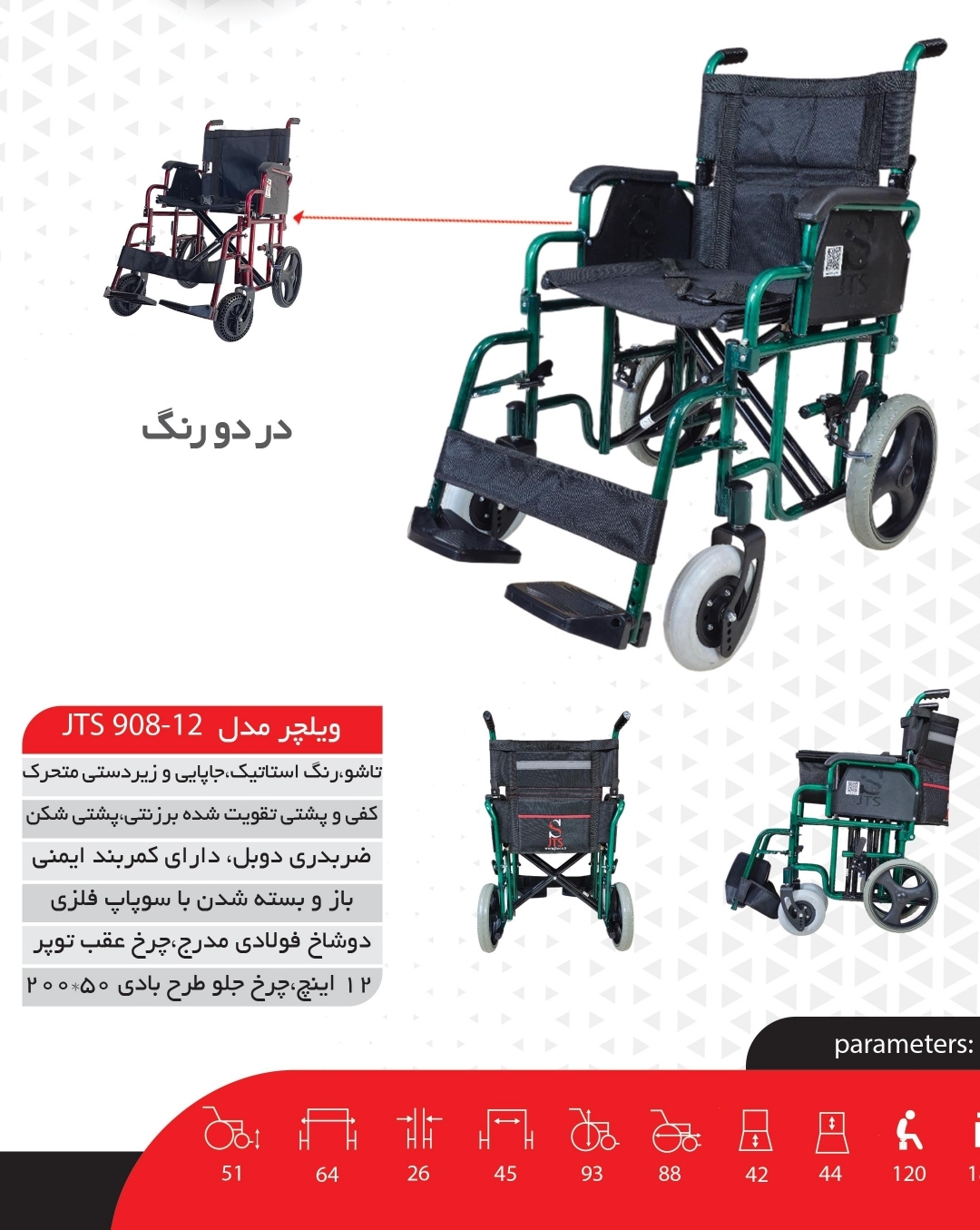 این ویلچر ساخت شرکت جهان تجهیزات شفا (JTS) است و به دلیل وزن مناسب، استحکام بالا و قابلیت تاشوندگی سریع، محبوبیت زیادی در مراکز درمانی دارد.