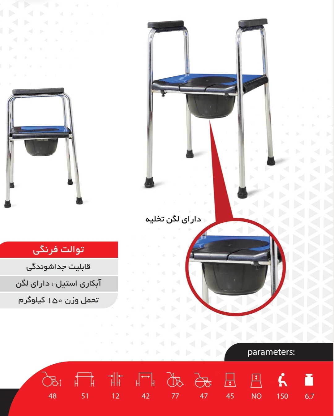 این مدل مجهز به لگن قابل جدا شدن است که شستشو و استفاده از آن را بسیار آسان و بهداشتی میکند. طراحی جمعشونده آن باعث میشود فضای کمی اشغال کرده و برای استفاده در منزل، بیمارستان، مراکز درمانی یا حتی سفر بسیار مناسب باشد. با توان تحمل وزن ۱۵۰ کیلوگرم، امنیت و استحکام کافی برای استفاده روزمره را فراهم میکند.