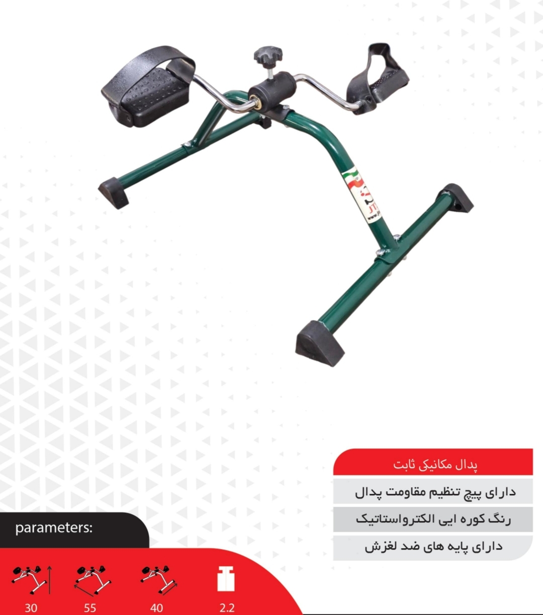 دارای پایههای ضد لغزش و پیچ تنظیم مقاومت است که امکان تنظیم شدت تمرین را مطابق نیاز کاربر فراهم میکند. بدنه مقاوم با رنگ کورهای الکترواستاتیک، دوام بالایی داشته و استفاده از آن را در خانه، کلینیک یا محل کار آسان میسازد